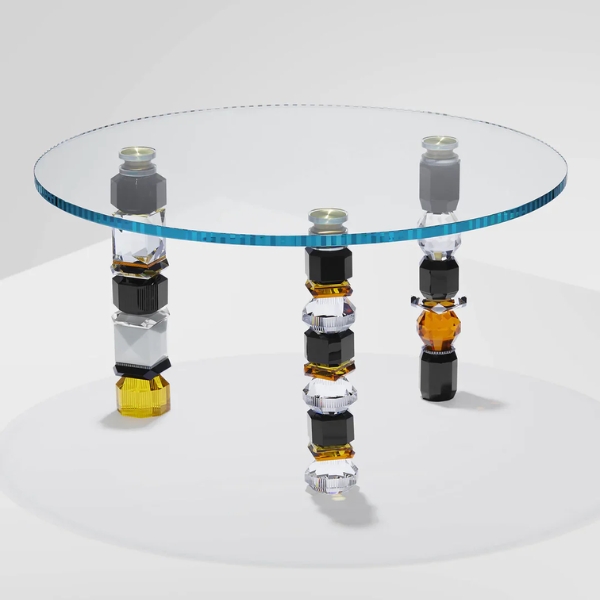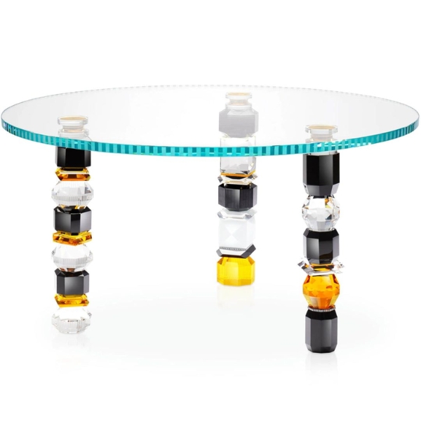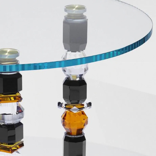 Bàn Louisiana Reflections Copenhagen kết hợp xu hướng hiện đại với các chi tiết và vật liệu lấy cảm hứng từ phong cách Glam Art Décor. Một chiếc đĩa thủy tinh đơn giản với các cạnh sắc nét sạch sẽ nằm trên chân bàn trà được làm bằng các cột thủy tinh pha lê màu theo hình dạng hình học.