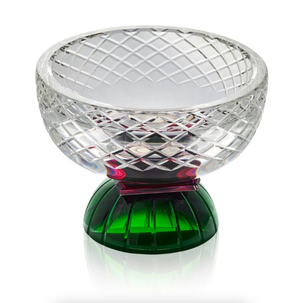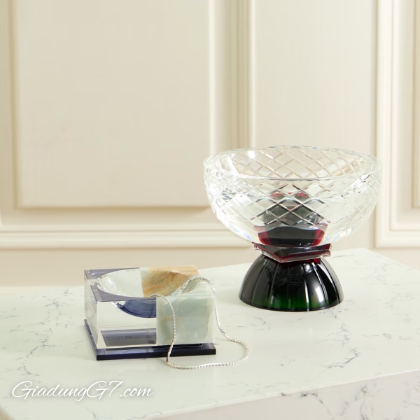 Điểm nhấn cuối cùng của bộ sưu tập này đến với chiếc bát Jackie. Hình dạng của chiếc bát này được tạo ra với sự chú ý đặc biệt để không chỉ hữu ích mà còn vô cùng đẹp mắt. Những đường gạch zigzag được khắc kim cương dọc theo bên của chiếc bát, và các mảng màu tím hoặc xanh lá cây thu hút sự chú ý đến nét cứng cáp và thanh lịch của chiếc bát này.