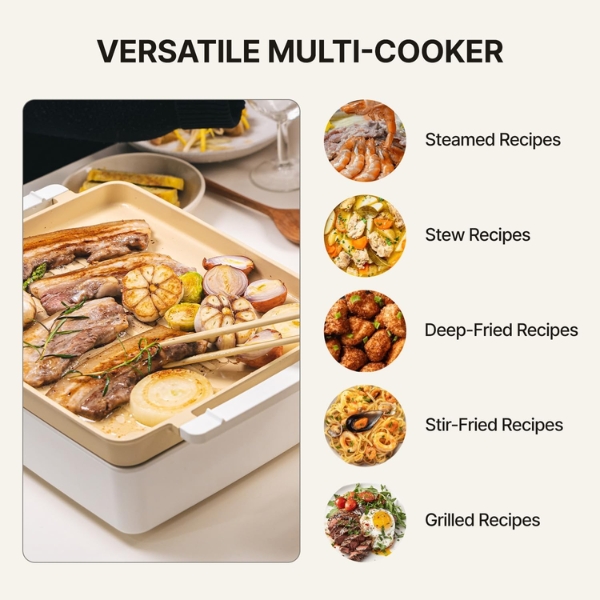 Chảo điện đa năng của chúng tôi có diện tích nướng lớn hơn trong một thân máy nhỏ gọn và thời gian làm nóng nhanh hơn (428°F / 220℃ trong 10 phút) so với các loại chảo nướng điện và nồi lẩu 3 trong 1 tương tự. Đi kèm với túi đựng có khóa dán giúp bạn cất giữ và vận chuyển nồi đa năng một cách tiện lợi.