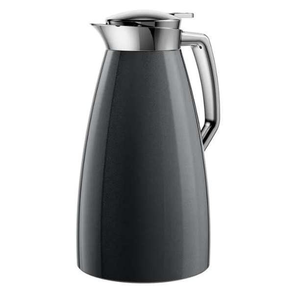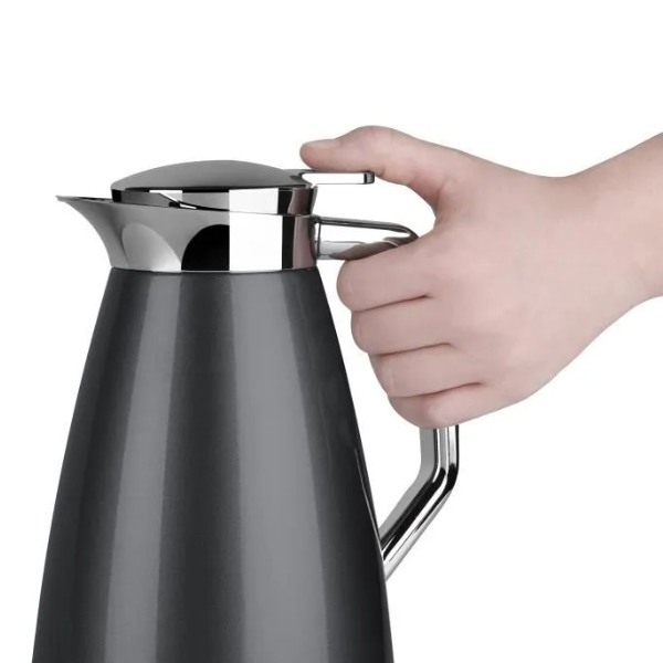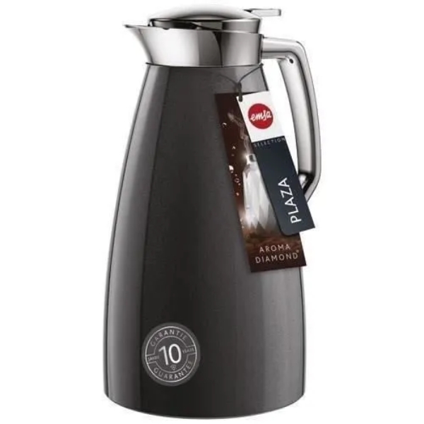 Bình giữ nhiệt Emsa Plaza 1 lít màu xám với 5 lớp tráng men, bóng đẹp, sang trọng. Bên ngoài bằng thép không gỉ, piston cách nhiệt bằng thủy tinh, 100%, dày đặc, vận hành bằng một tay, hình dáng cổ điển, lớp hoàn thiện sa tanh, có tay cầm Quick Tip