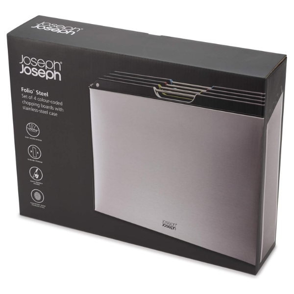 Bộ 4 thớt Joseph Joseph 60170 Folio steel màu inox - Bộ thớt thép Folio™ của chúng tôi là giải pháp hoàn hảo để giữ cho tất cả các thớt của bạn được sắp xếp gọn gàng và dễ dàng lấy ra sử dụng.