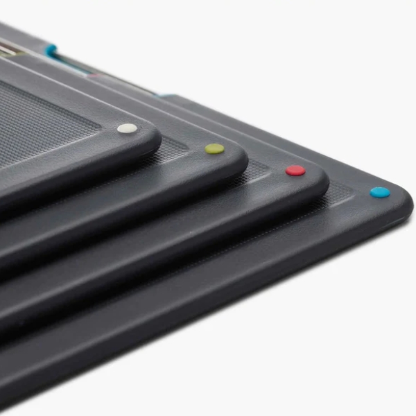 Mỗi thớt đều có bề mặt nhám thân thiện với dao và các chi tiết được mã hóa màu sắc giúp việc chuẩn bị thực phẩm trở nên vệ sinh và hiệu quả hơn. Điểm nhấn cuối cùng? Một hộp đựng bằng thép không gỉ giúp giữ cho các thớt luôn ngăn nắp và gọn gàng trên mặt bàn.