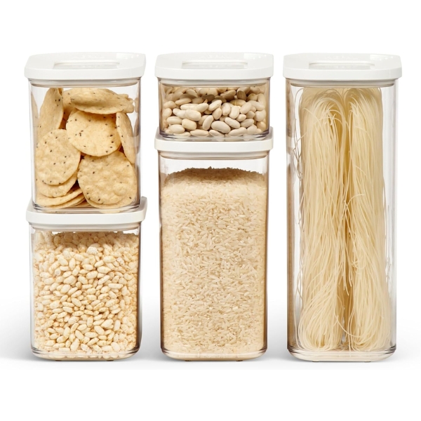 Bộ sản phẩm gồm 5 hộp với dung tích khác nhau:Thiết kế này phù hợp với hầu hết các bao bì thực phẩm khô, từ gói mì ống, bột mì cho đến yến mạch hay sữa bột.