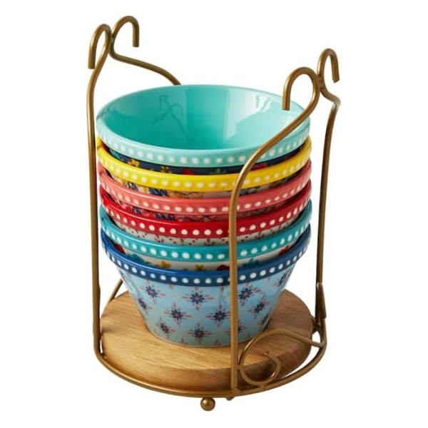 Giá đỡ giúp bạn dễ dàng cất giữ hoặc mang những chiếc bát nhỏ này đi khắp bếp. Được làm từ gốm sứ bền chắc, những chiếc bát nhỏ này có màu sắc tươi sáng và nhiều kiểu dáng đẹp mắt. Vừa đa năng vừa duyên dáng, bộ bát sứ nhỏ Fancy Flourish kèm giá đỡ chắc chắn sẽ là một bổ sung tuyệt vời cho bộ sưu tập dụng cụ làm bánh của bạn.