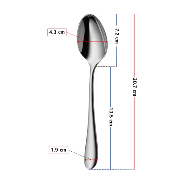 Đầu thìa có thiết kế đối xứng, bo tròn mềm mại, mang lại cảm giác thoải mái khi sử dụng, đồng thời hoàn thiện vẻ đẹp tinh tế trên bàn ăn. Sự đơn giản, hiện đại trong thiết kế giúp bộ thìa dễ dàng phối hợp với mọi phong cách nội thất – từ cổ điển ấm cúng cho đến sang trọng hiện đại.