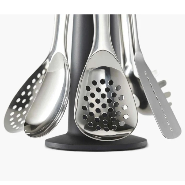 Bộ xoay Elevate™ Steel bao gồm thìa có rãnh, muỗng lật có rãnh, kẹp mì spaghetti, thìa đặc, muỗng múc canh và muỗng vớt bọt, tất cả đều được làm từ thép không gỉ bền chắc và silicon chịu nhiệt trên tay cầm. Giá xoay đảm bảo bạn dễ dàng lấy từng dụng cụ khi cần.