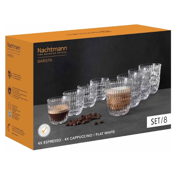 Bộ 8 cốc pha lê Nachtmann Ethno Barista 90ml và 234ml 105601 bao gồm 8 ly, bao gồm 4 ly cappuccino và 4 ly espresso để có trải nghiệm cà phê hoàn chỉnh và phong cách.