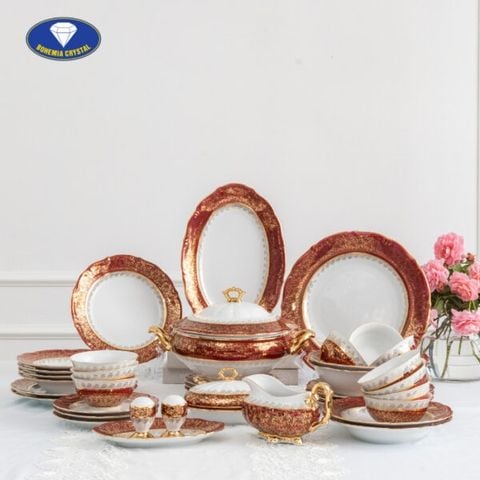 Bộ bát đĩa sứ Tiệp nền đỏ dây vàng 38 món - Nhập Khẩu Từ Tiệp Khắc - Vẻ Đẹp Hoàn Mỹ, Chất Lượng Đỉnh Cao.