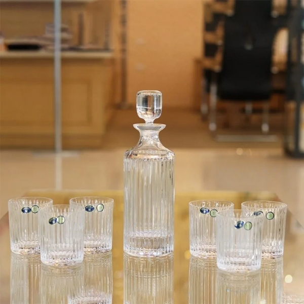 - Thiết kế sang trọng: Bình rượu dung tích 0,7L kèm 6 cốc 320ml với họa tiết sọc độc đáo, tạo nên ánh sáng lấp lánh đầy mê hoặc trong từng góc nhìn.