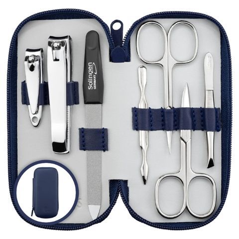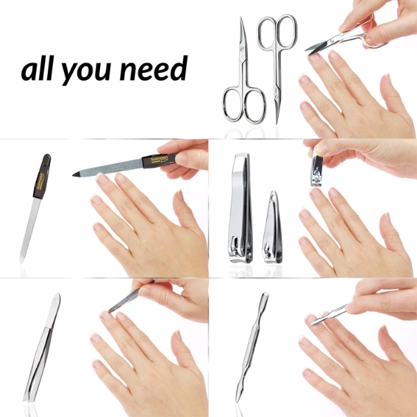 - Bộ dụng cụ làm móng tay, móng chân hoàn chỉnh dành cho cả nam và nữ này giúp bạn có bộ móng dài, khỏe và đẹp! Bao gồm 1 kềm cắt móng tay, 1 kềm cắt móng chân, 1 nhíp, 1 kéo cắt móng, 1 kéo cắt biểu bì, 1 dũa móng tay bằng đá saphire 125/75µm - thô và mịn - tất cả được đựng trong hộp làm móng bằng da mềm.