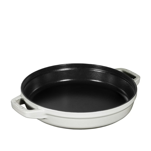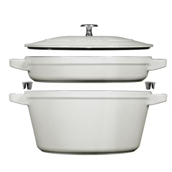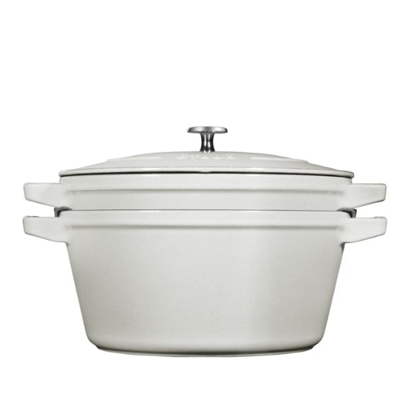 Bộ nồi gang kèm chảo Staub 24cm 2in1 - Màu trắng gồm một nồi nhỏ và một nồi lớn có nắp đậy, làm bằng gang tráng men đen. Khả năng xếp chồng hai món giúp dễ dàng cất giữ, tiết kiệm không gian. Bao gồm hai miếng bảo vệ cạnh được đặt giữa nồi nhỏ và nồi lớn, cần phải tháo ra trước khi nấu.