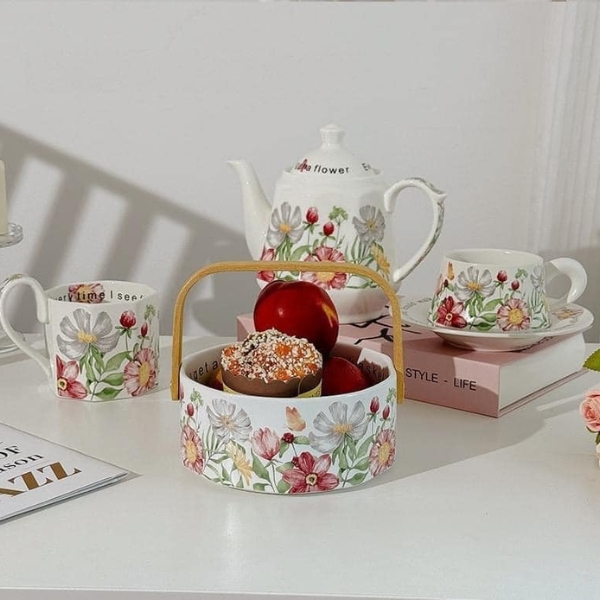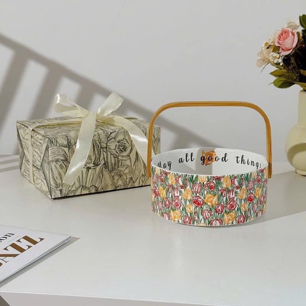 - Giỏ sứ có tay cầm để bánh, trái cây: Kích thước: đường kính miệng15cm x 7cm x 14cm. 800ml