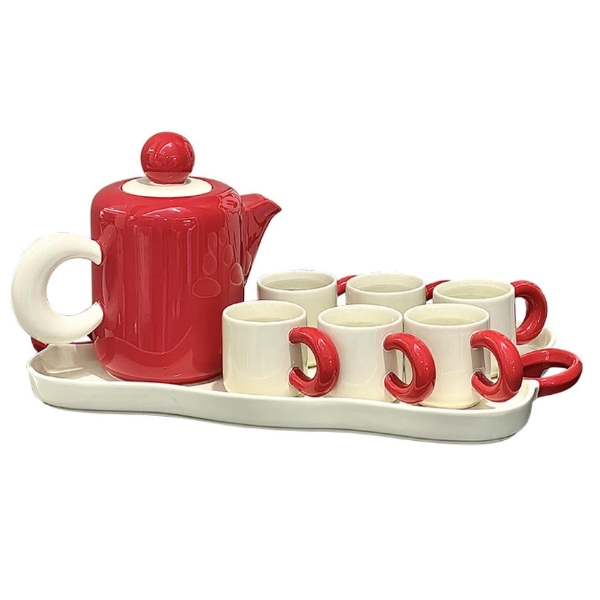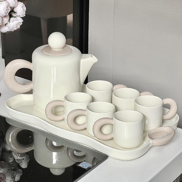 Bộ trà sứ Dopamine kèm khay Phong cách Bắc Âu - 1 bình 6 cốc được làm bằng gốm, kết cấu của da mịn, và khi tráng men để làm cho nó mịn hơn, dày đặc và có khả năng chống mài mòn cao, nắp và ấm trà có độ kín tốt.