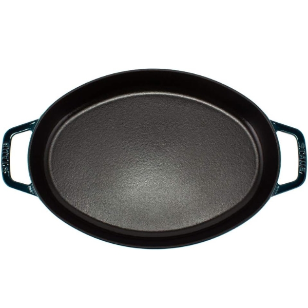 Chảo gang oval Staub nắp cá 32cm tráng men kiểu Pháp có những đặc tính nấu nướng tuyệt vời tương tự như nồi Cocotte. Lớp men gang giúp phân bổ nhiệt đều, cho kết quả tốt nhất và giữ nhiệt lâu, đảm bảo thức ăn luôn nóng trong suốt bữa ăn.