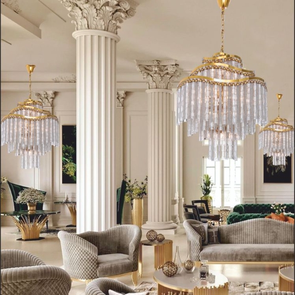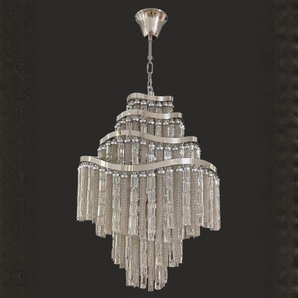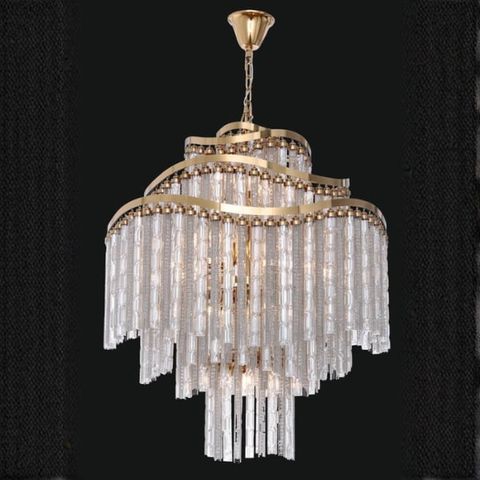 Thân đèn gồm các ống pha lê và các dây hạt pha lê với tạo hình xoắn mềm mại