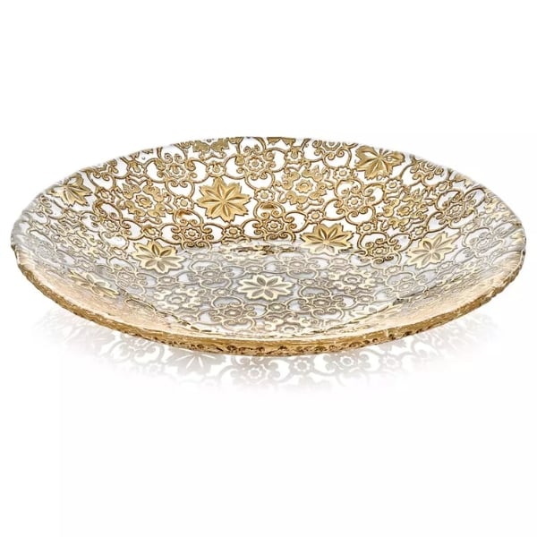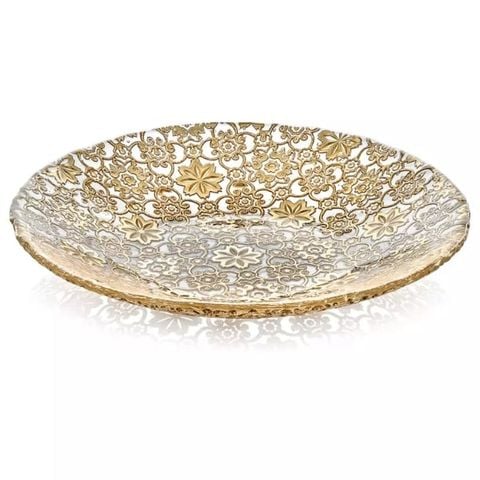 Đĩa IVV Arabesque Centrepiece Gold Leaf 41cm - Tất cả các đồ vật bằng thủy tinh ép có trang trí lá vàng trên bề mặt bên ngoài của bộ sưu tập Arabesque đều có đặc điểm là thiết kế tái hiện họa tiết nguyên bản ở bên ngoài, đặc biệt sáng và rất dễ chịu khi chạm vào.