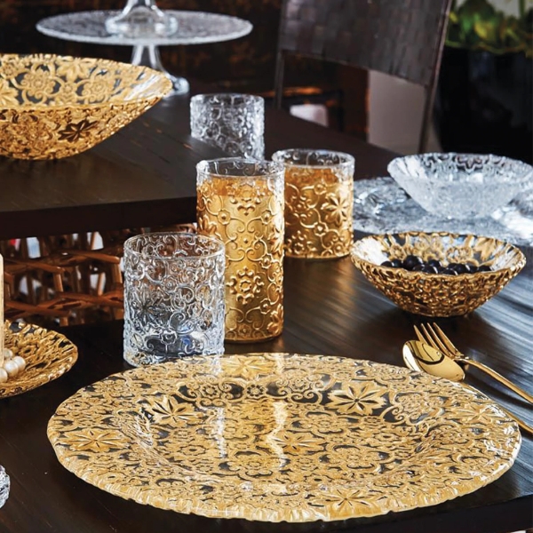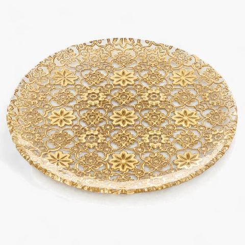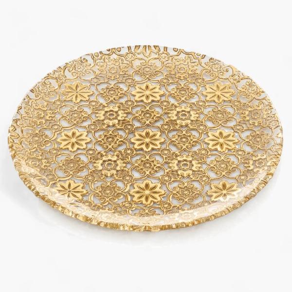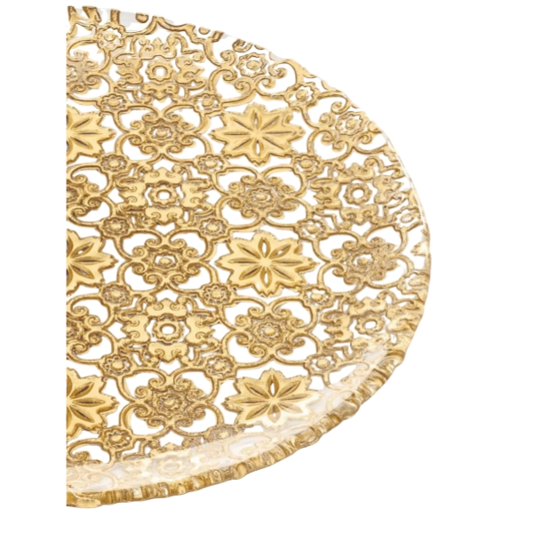 Đĩa IVV Arabesque Gold Leaf 37cm - Tất cả các đồ vật bằng thủy tinh ép có trang trí lá vàng trên bề mặt bên ngoài của bộ sưu tập Arabesque đều có đặc điểm là thiết kế tái hiện họa tiết nguyên bản ở bên ngoài, đặc biệt sáng và rất dễ chịu khi chạm vào.