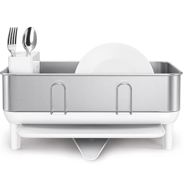 Giá phơi bát đĩa nhà bếp nhỏ gọn simplehuman có vòi xoay, khung thép không gỉ chống dấu vân tay, nhựa màu trắng