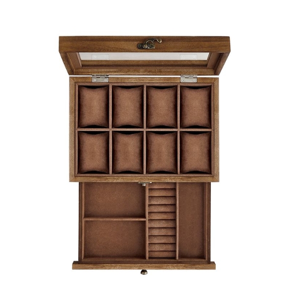 Có 8 khe cắm đồng hồ ở phía trên và nhiều ngăn ở ngăn kéo dưới cùng để đựng vòng tay và nhẫn của bạn. Hộp đựng đồng hồ 2 tầng này cho phép bạn cất giữ đồng hồ và đồ trang sức của mình