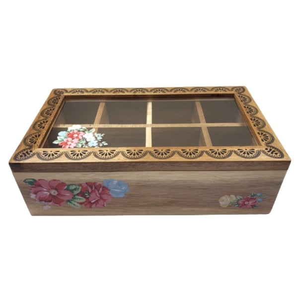 Hộp đựng trà bằng gỗ trang trí với nắp trong suốt - họa tiết hoa, mộc mạc và đầy cá tính.