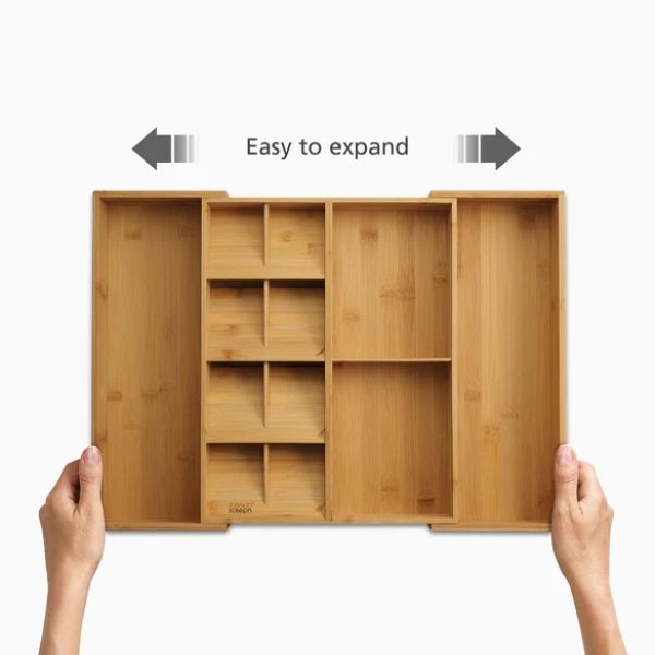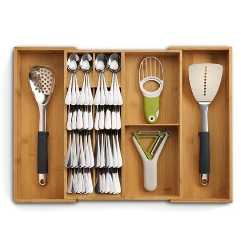 Tận dụng tối đa không gian và sắp xếp dao kéo, dụng cụ nhà bếp trong ngăn kéo của bạn với khay đựng dao kéo và dụng cụ nhà bếp bằng tre có thể mở rộng Joseph Joseph DrawerStore.
