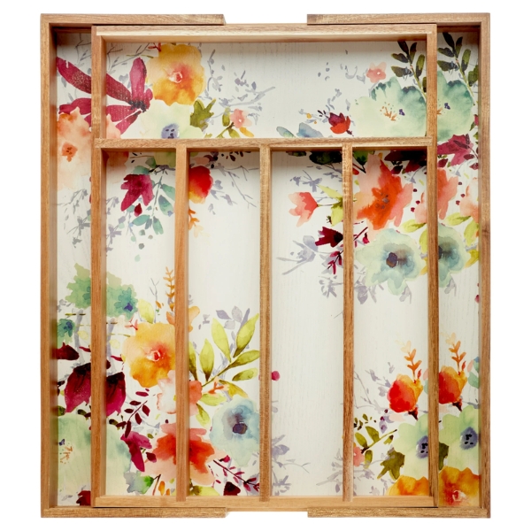Lớp hoàn thiện bằng gỗ tự nhiên làm tăng thêm vẻ đẹp đơn giản nhưng thanh lịch cho sản phẩm này. Khay có năm ngăn, có thể mở rộng thành tổng cộng bảy ngăn để đáp ứng mọi nhu cầu lưu trữ của bạn. Bạn có thể hoàn thiện bộ sản phẩm bằng cách mua thêm hộp đựng đồ dùng nhà bếp cùng kiểu dáng.