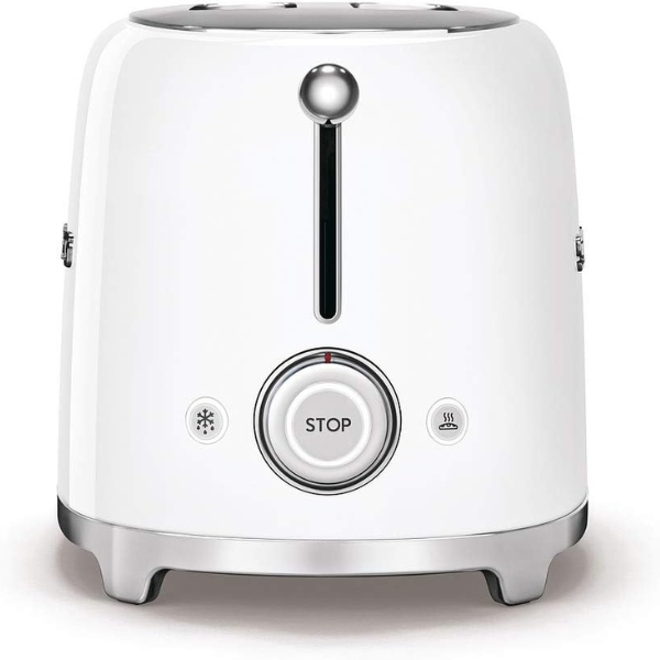 Máy nướng bánh mì hai lát Smeg TSF01WHEU bằng thép sơn tĩnh điện lý tưởng có thiết kế cổ điển của thập niên 50 và các rãnh cực rộng để nướng những lát bánh mì và bánh mì tròn dày đẹp mắt; có sẵn trong tám màu sắc bắt mắt