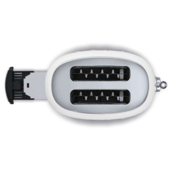 Máy nướng bánh mỳ Smeg TSF01WHEU có Khay đựng vụn bằng thép không gỉ có thể tháo rời bằng cảm ứng giúp xử lý nhanh chóng và dễ dàng tất cả những mảnh vụn thừa đó