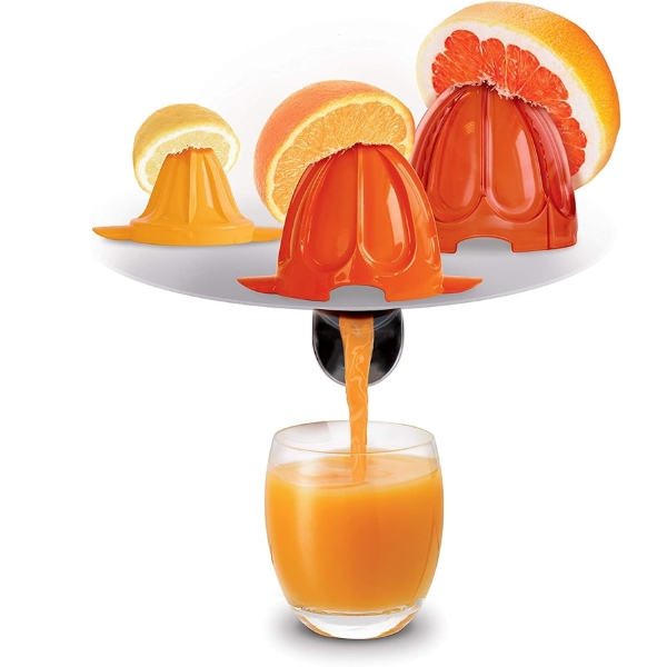 Máy được trang bị 3 nón vắt với màu sắc khác nhau, giúp người dùng dễ dàng phân biệt và lựa chọn núm vắt phù hợp với từng loại trái cây như cam, quýt, bưởi… Nhờ vậy, việc ép nước từ các loại trái cây có múi trở nên nhanh chóng, tiện lợi và hiệu quả hơn bao giờ hết.
