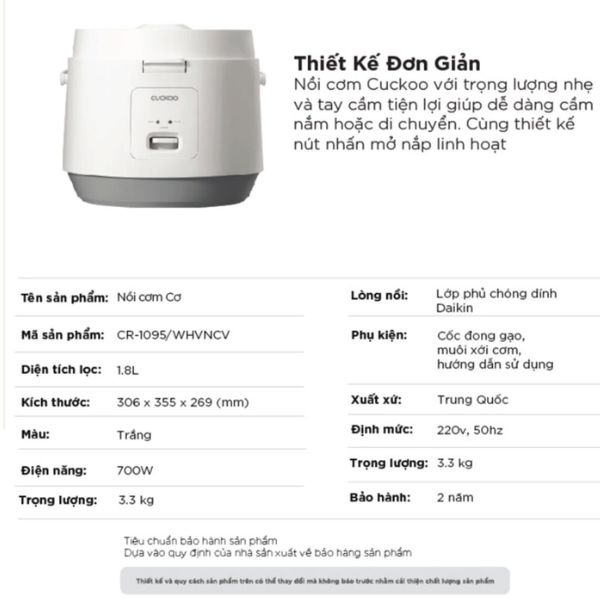 Nồi cơm điện Cuckoo CR-1095 là sự lựa chọn tuyệt vời cho gia đình từ 4 đến 6 người với dung tích 1.8 lít và công suất 700W. Với các tính năng nổi bật như công nghệ nấu 3D, lòng nồi chống dính, nắp phụ tháo rời dễ vệ sinh và thiết kế hiện đại, sản phẩm này sẽ giúp bạn tiết kiệm thời gian và mang lại những bữa cơm ngon miệng cho gia đình.