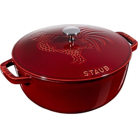 Nồi gang tròn Staub 24cm 3.7L nắp hình gà - Màu Đỏ Rượu lý tưởng cho việc sử dụng hàng ngày, chẳng hạn như ninh và chiên thực phẩm. Hình dạng tròn đẹp mắt sẽ bền bỉ theo thời gian.