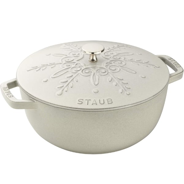 Nồi gang Staub Snowflake Winter 24cm kiểu Pháp với nắp hình bông tuyết là một vật dụng tuyệt đẹp để tạo không khí mùa đông. Nồi hầm kiểu Pháp với màu kem là một sự bổ sung tuyệt đẹp cho bất kỳ bầu không khí nào.