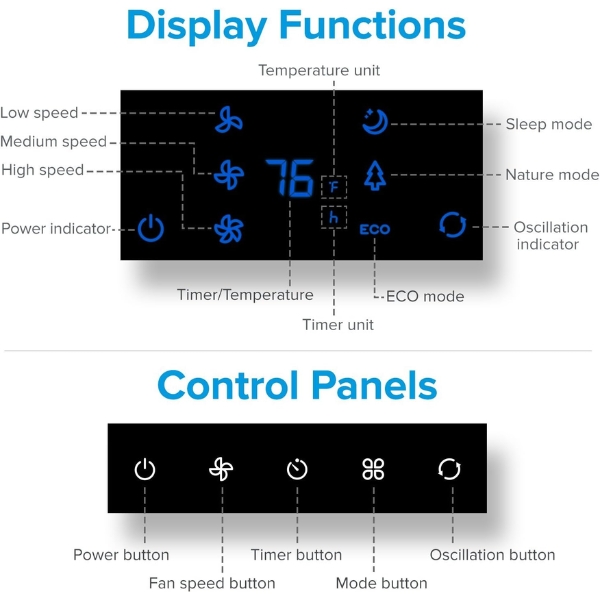 - Màn hình LED mượt mà: dễ dàng đọc nhiệt độ phòng, cài đặt tốc độ đã chọn và chế độ, sau đó chỉ cần tắt màn hình khi bạn không cần sử dụng