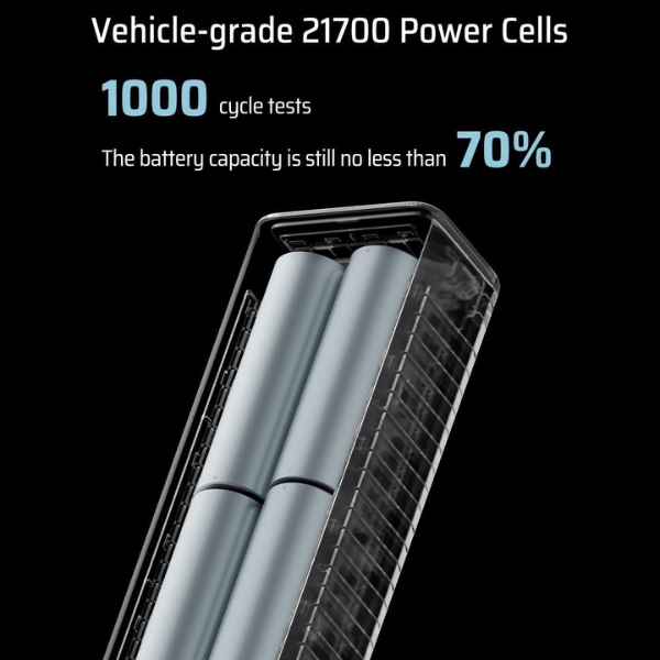 Sử dụng cell năng lượng 21700 tự động và có tấm tản nhiệt kim loại cực lớn, bộ sạc di động nhanh đảm bảo tản nhiệt hiệu quả. Được trang bị bốn cảm biến nhiệt độ tích hợp, bộ sạc theo dõi biến động nhiệt độ theo thời gian thực, tăng cường an toàn hơn nữa.