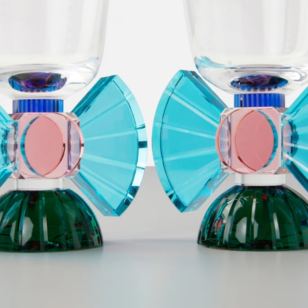 Bộ hai chiếc ly 'Somerset' của Reflections Copenhagen thể hiện tình yêu của nhà sáng lập Andrea Larsson dành cho những hình khối lập dị và màu sắc táo bạo. Lấy cảm hứng từ đồ thủy tinh truyền thống của Anh, chúng được làm từ pha lê cắt thủ công với sự chú ý đặc biệt đến từng chi tiết và có các chi tiết loe ra mô phỏng cánh bướm.
