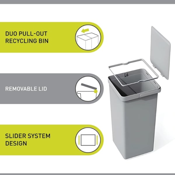 Thiết kế thông minh của Deco Duo cho phép bạn cất giữ thùng rác ở những khu vực khuất tầm nhìn, giúp giữ không gian bếp sạch sẽ và ngăn nắp. Bạn chỉ cần trượt thùng rác ra phía trước để dễ dàng lấy rác và kéo lại sau khi sử dụng. Thùng rác có các ngăn chứa có thể tháo rời, cùng tay cầm tích hợp giúp việc thay túi và vệ sinh trở nên dễ dàng hơn bao giờ hết.