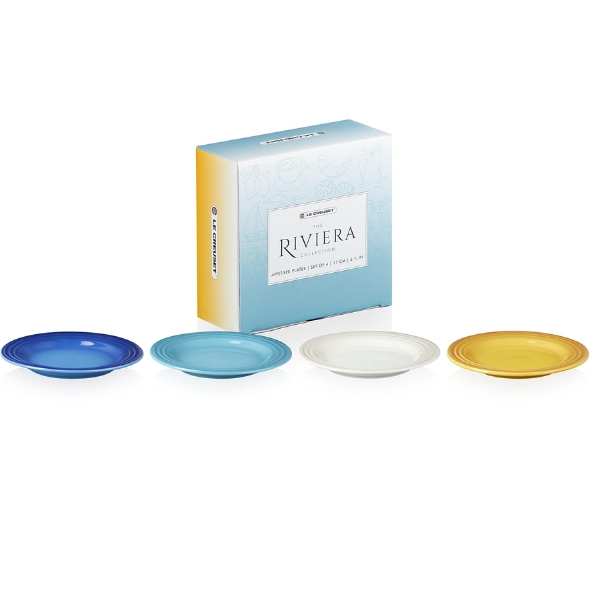 - Bộ 4 đĩa khai vị Riviera Stoneware màu xanh ngọc, màu Meringue, màu Azuer và màu Nectar