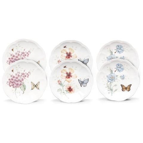Hãy bày biện bàn ăn của bạn với bộ đĩa 6 món xinh xắn này, gồm ba cặp đĩa nhỏ với họa tiết Butterfly Meadow phổ biến: đuôi hổ vàng, bướm chúa vàng và bướm xanh da trời. Bộ đĩa sứ trắng bền chắc với các cạnh viền hình vỏ sò tinh tế và an toàn với cả máy rửa chén và lò vi sóng!