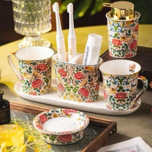 - 1 đĩa, 1 cốc đựng bàn chải, 1 khay để xà phòng, 1 bình đựng xà phòng có vòi và 2 cốc đánh răng