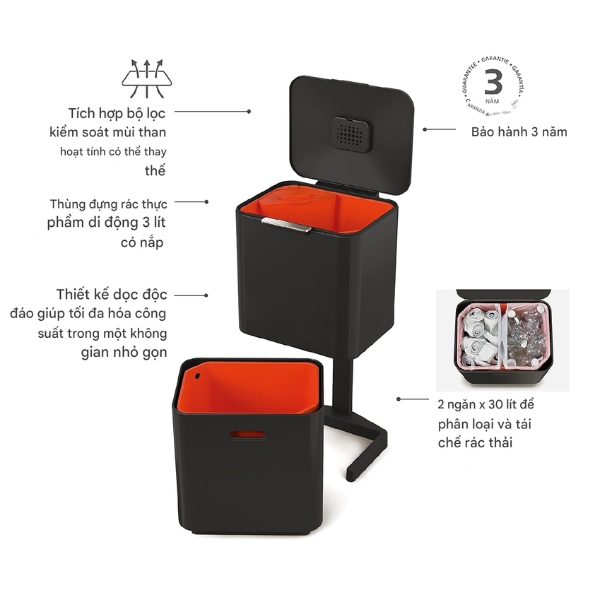 Tính năng Thùng rác 2 ngăn Joseph Joseph 30106 60L Totem Max màu đen carbon