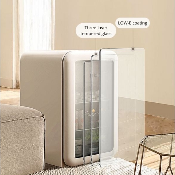 Cửa tủ được làm bằng kính cường lực ba lớp, giúp tăng cường độ bền và khả năng cách nhiệt, đồng thời hỗ trợ việc quan sát dễ dàng những vật dụng được lưu trữ bên trong. Nhờ vào chất liệu này, tủ lạnh không chỉ duy trì nhiệt độ ổn định mà còn đảm bảo hiệu suất năng lượng tối ưu, giúp tiết kiệm điện.